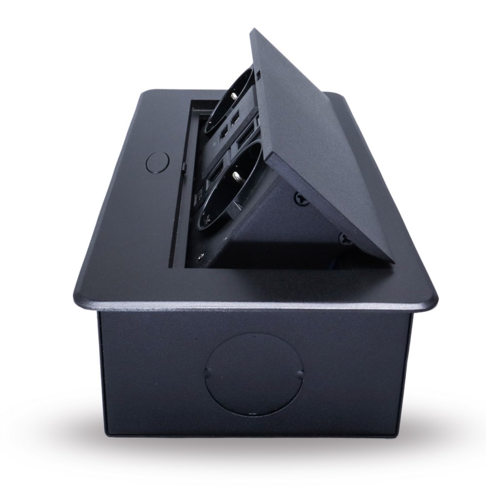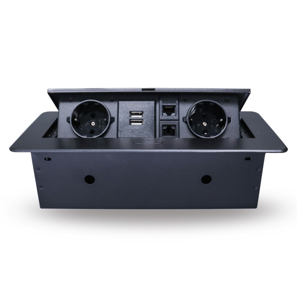 Розетка горизонтальная выдвижная 2 Euro 16А, 2 USB A с блоком 5В/2.1А, 2 RJ45 RocketSocket, проводка, цвет черный в Орске