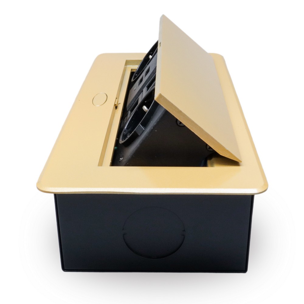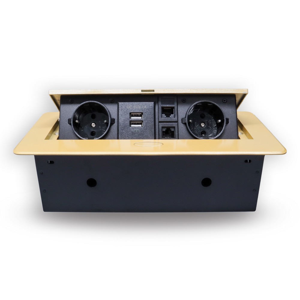Розетка горизонтальная выдвижная 2 Euro 16А, 2 USB A с блоком 5В/2.1А, 2 RJ45 RocketSocket, проводка, цвет золотой в Орске