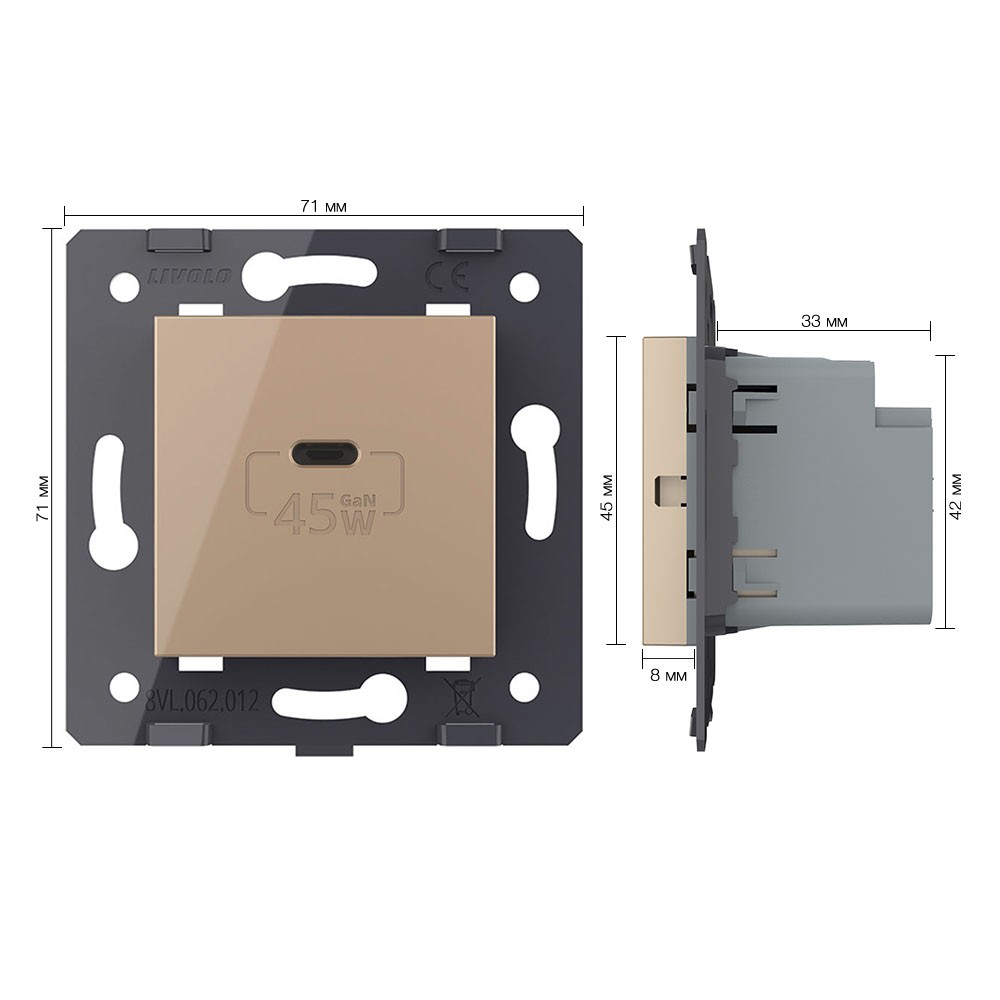 Розетка USB type C с блоком питания 45W, цвет золотой (механизм) Livolo в Орске
