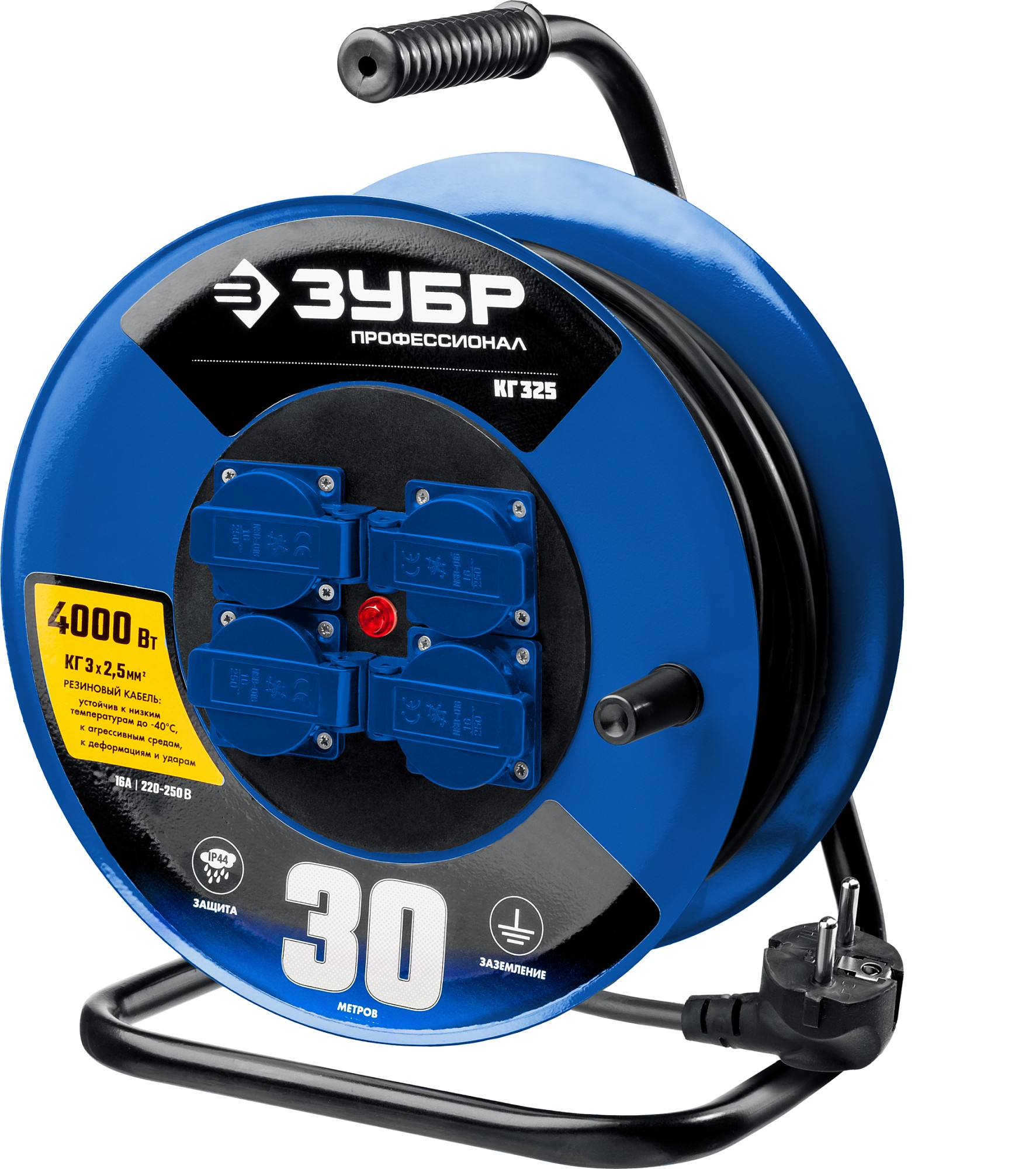 Силовой удлинитель на стальной катушке КГ 3х2.5 30м 4000Вт IP44, КГ 325 ЗУБР в Орске