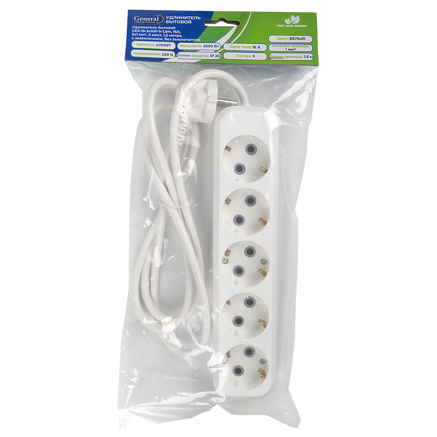Удлинитель бытовой GES-16-3x100-5-1,5m, 16А, 3х1 мм2, 5 мест, 1,5 метра, с заземлением, без выключателя General в Орске