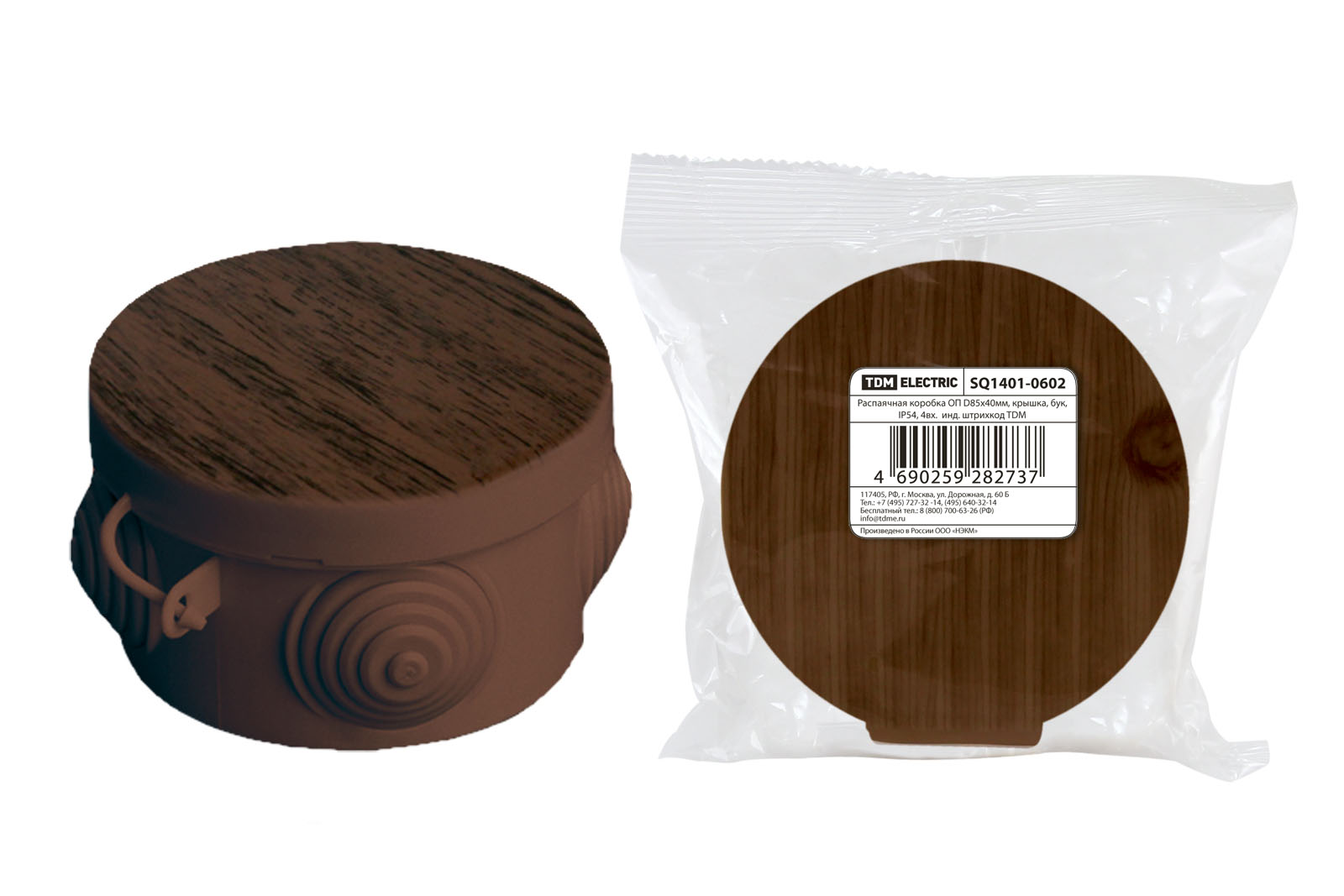 Распаячная коробка ОП D85х40мм, крышка, "ЭКО" (венге), IP54, 4вх. инд. штрихкод TDM доступен в интернет‑магазине ВольтМаркет в Орске. Покупая у нас, вы получаете дополнительные преимущества: