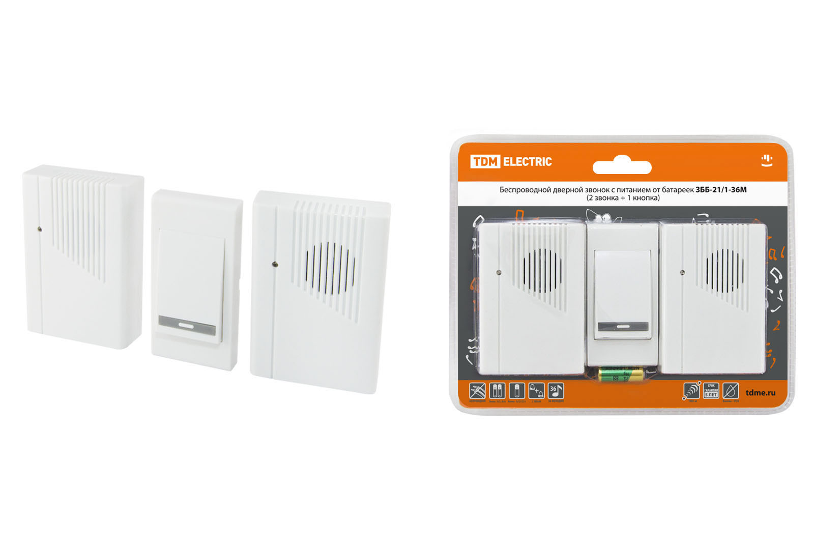 Звонок беспроводной на батарейках ЗББ-21/1-36М (36 мелодий, кнопка IP30, 2х1,5В АА, 2 звонка) TDM в Орске