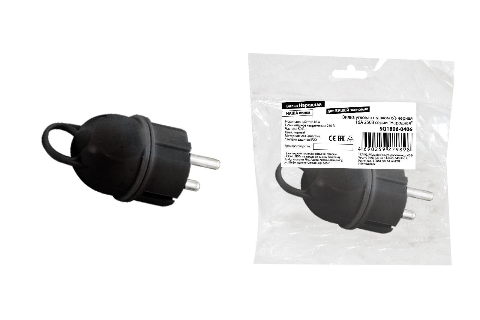 Вилка угловая с ушком с/з черная 16А 250В серии "Народная" в Орске