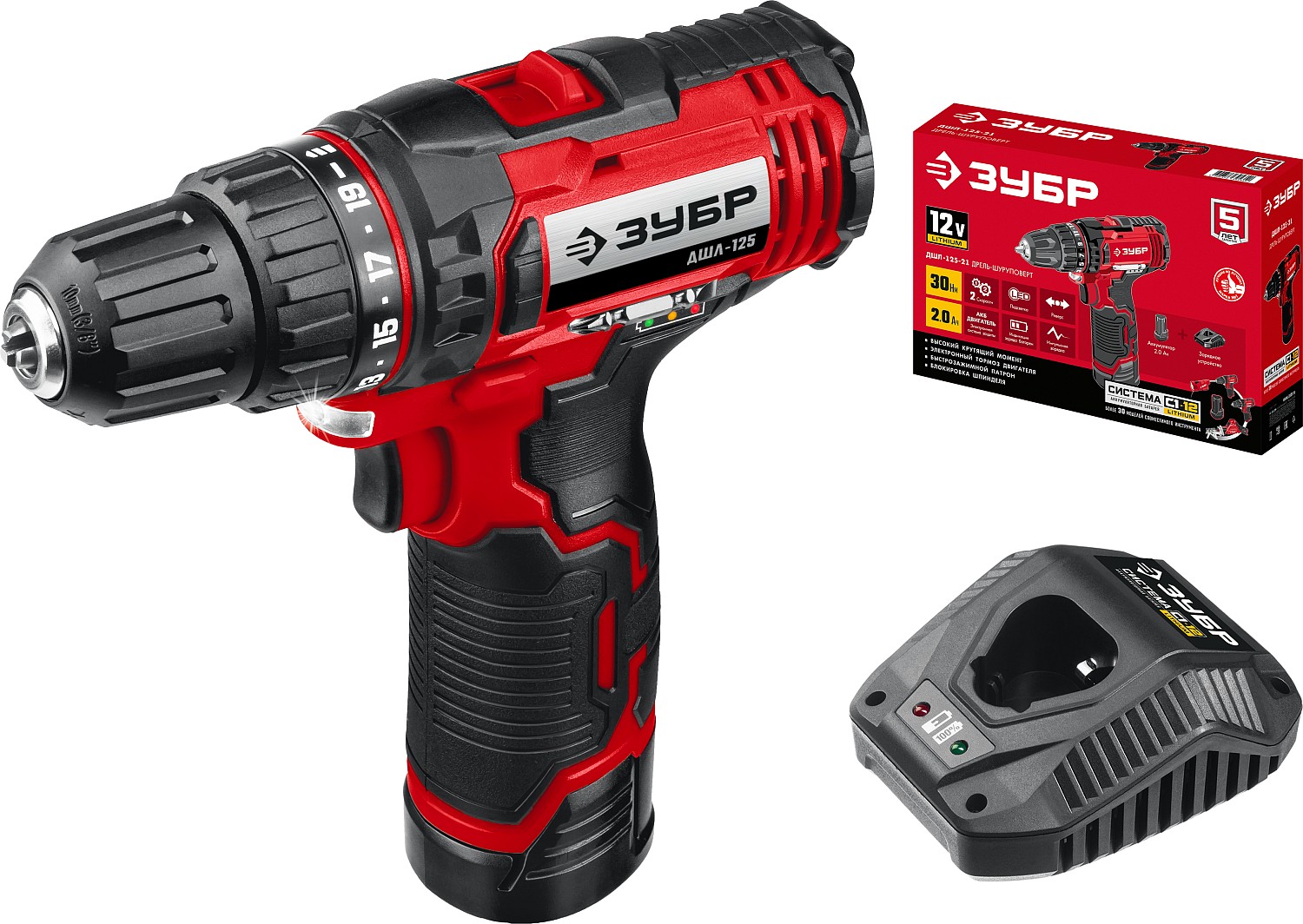 12В, 1 АКБ (2Ач), в коробке, дрель-шуруповерт. ДШЛ-125-21 ЗУБР в Орске