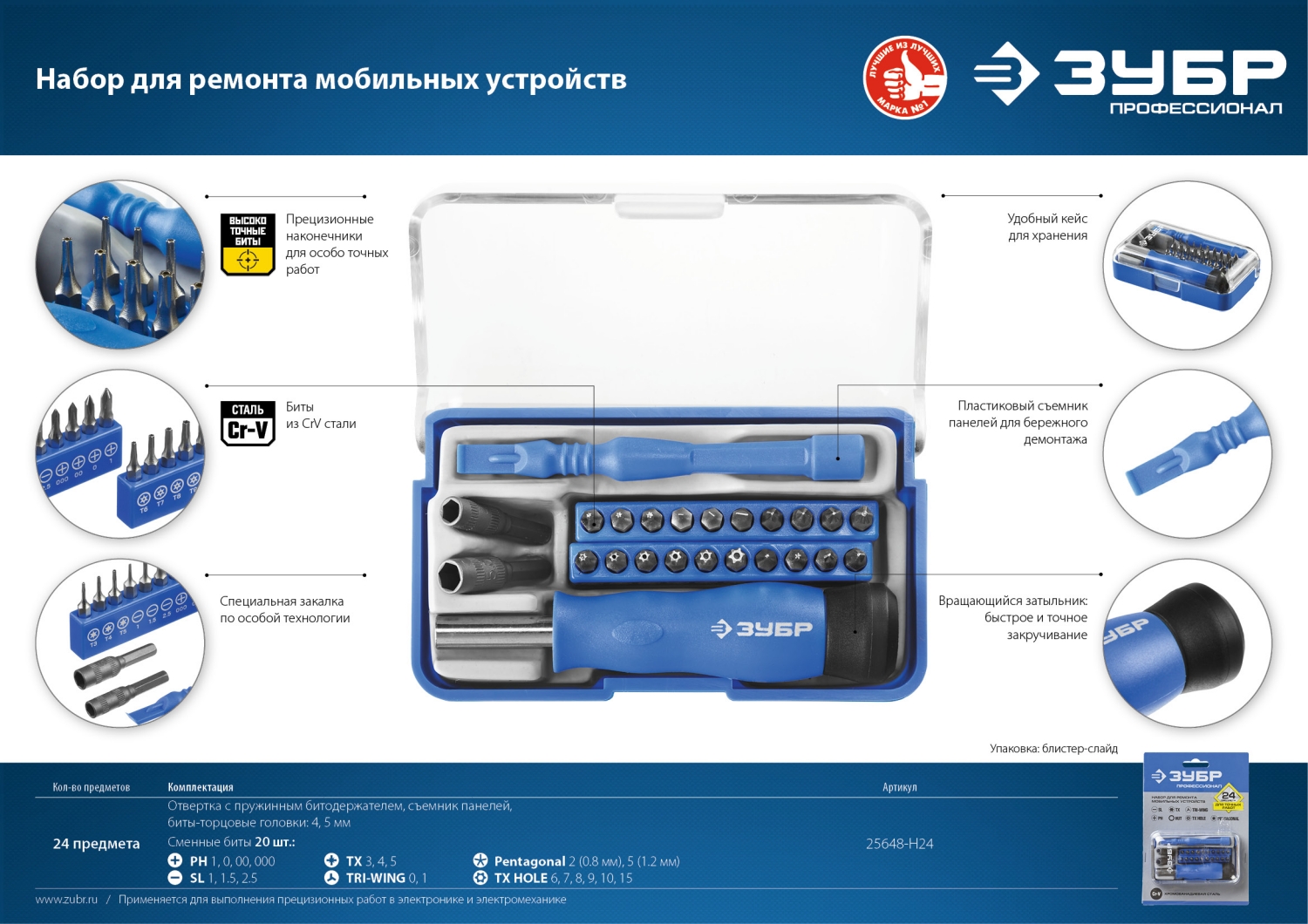 Отвертка с битами для точных работ и мобильных устройств 24 предм., ЗУБР в Орске