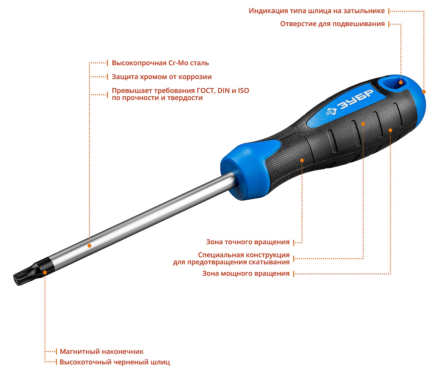Эргономичная рукоятка обеспечивает комфортный захват, снижает утомляемость руки при длительной работе и повышает эффективность закручивания или откручивания винтов.