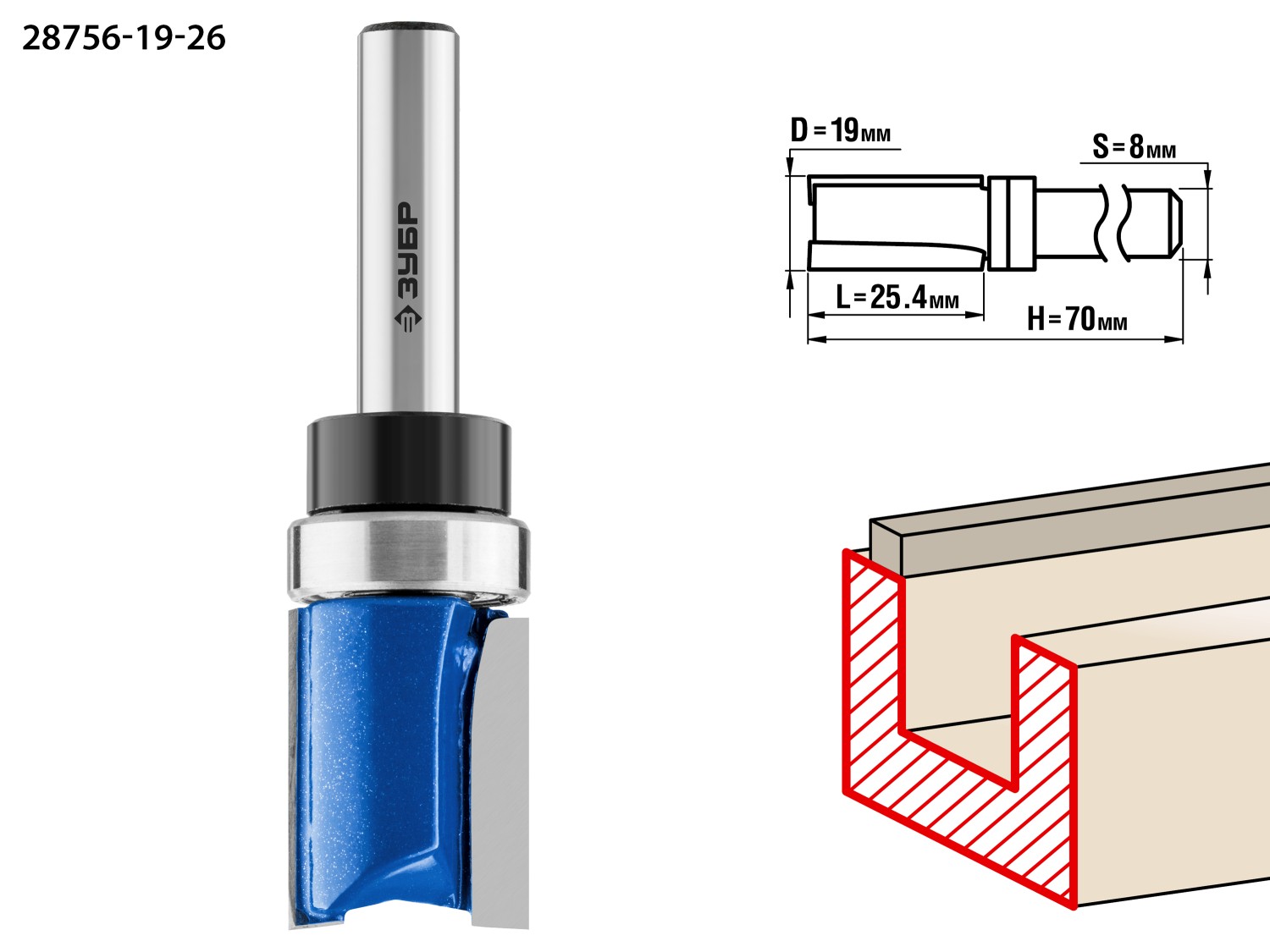 19x26мм, хвостовик 8мм, фреза пазовая прямая с верхним подшипником ЗУБР в Орске