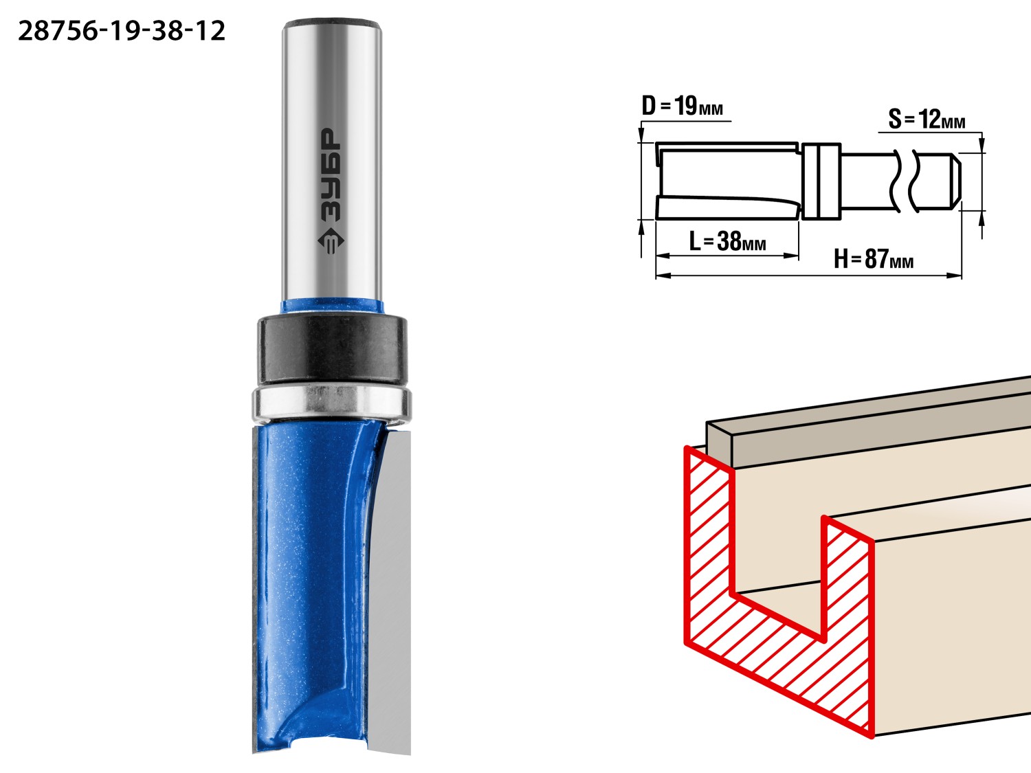 19x38мм, хвостовик 12мм, фреза пазовая прямая с верхним подшипником ЗУБР в Орске