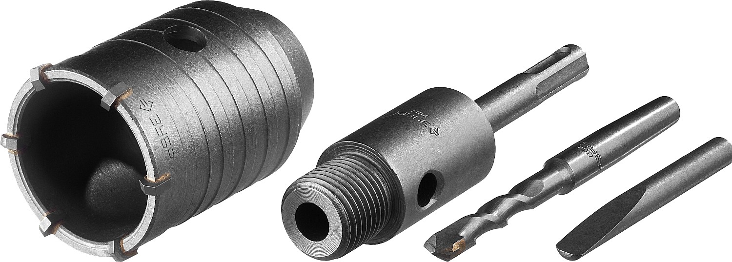 - Патроны и адаптеры для крепления коронок к дрели или перфоратору.