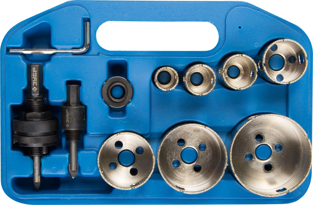 Набор коронок алмазных с оснасткой, D=19, 25, 28, 35, 45, 55, 65 мм, 7 коронок, ЗУБР в Орске