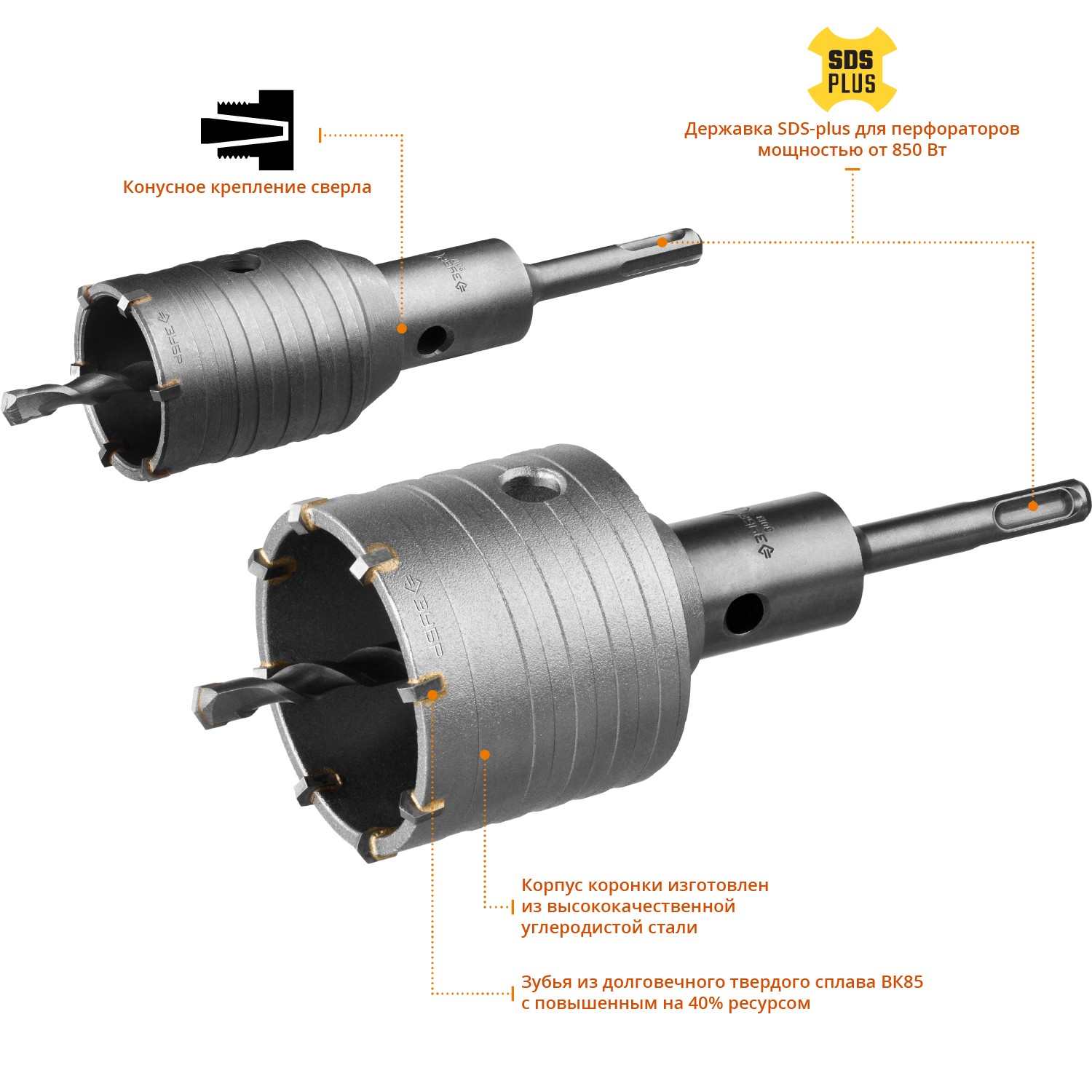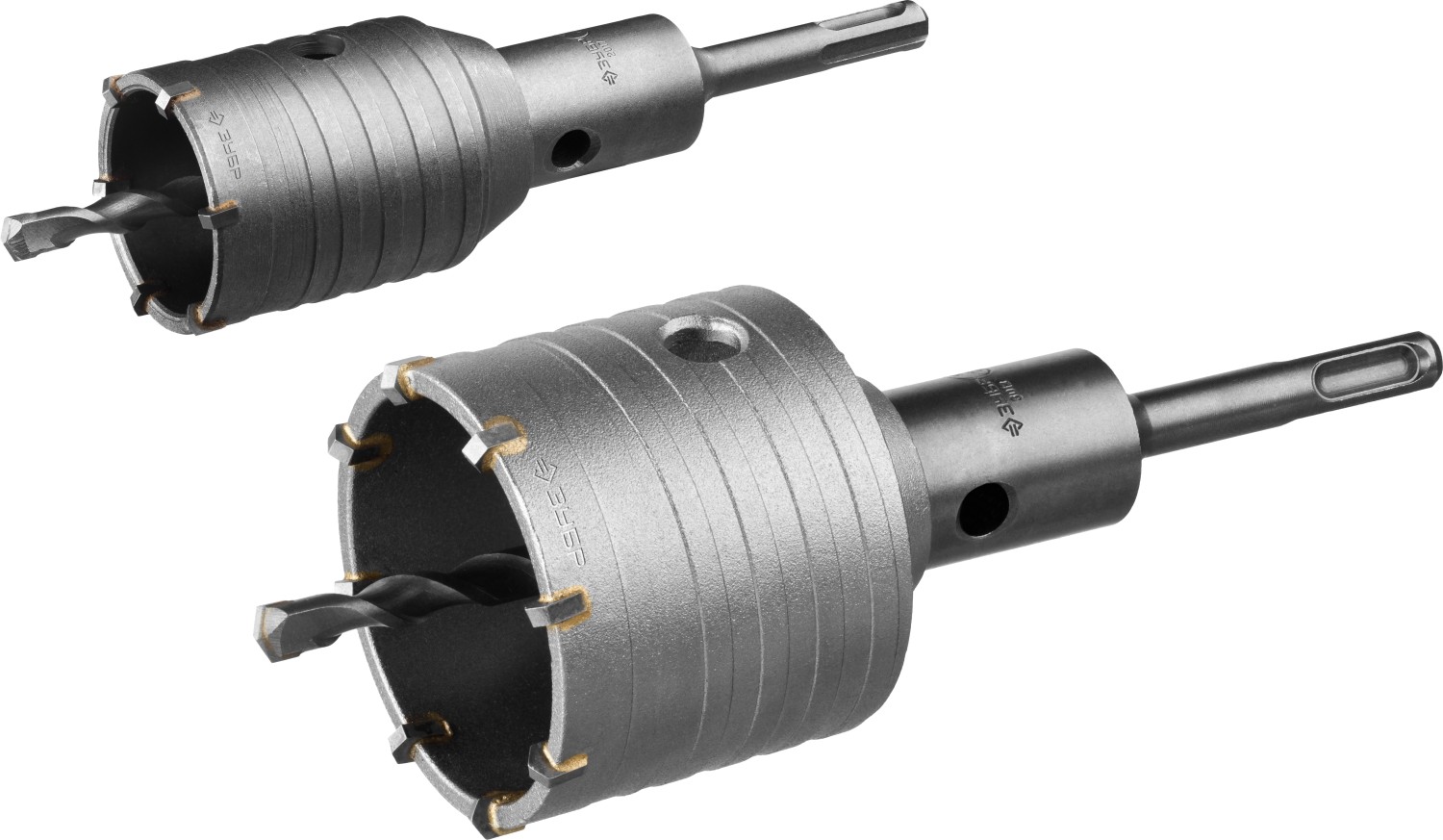 - Коронки с твердосплавными зубьями — для бетона и камня.
