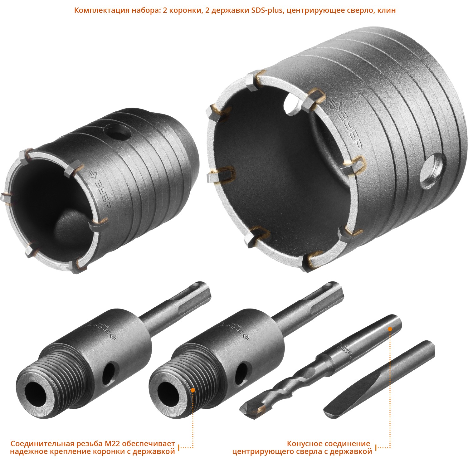 - Алмазные коронки — для точного сверления твердых материалов.