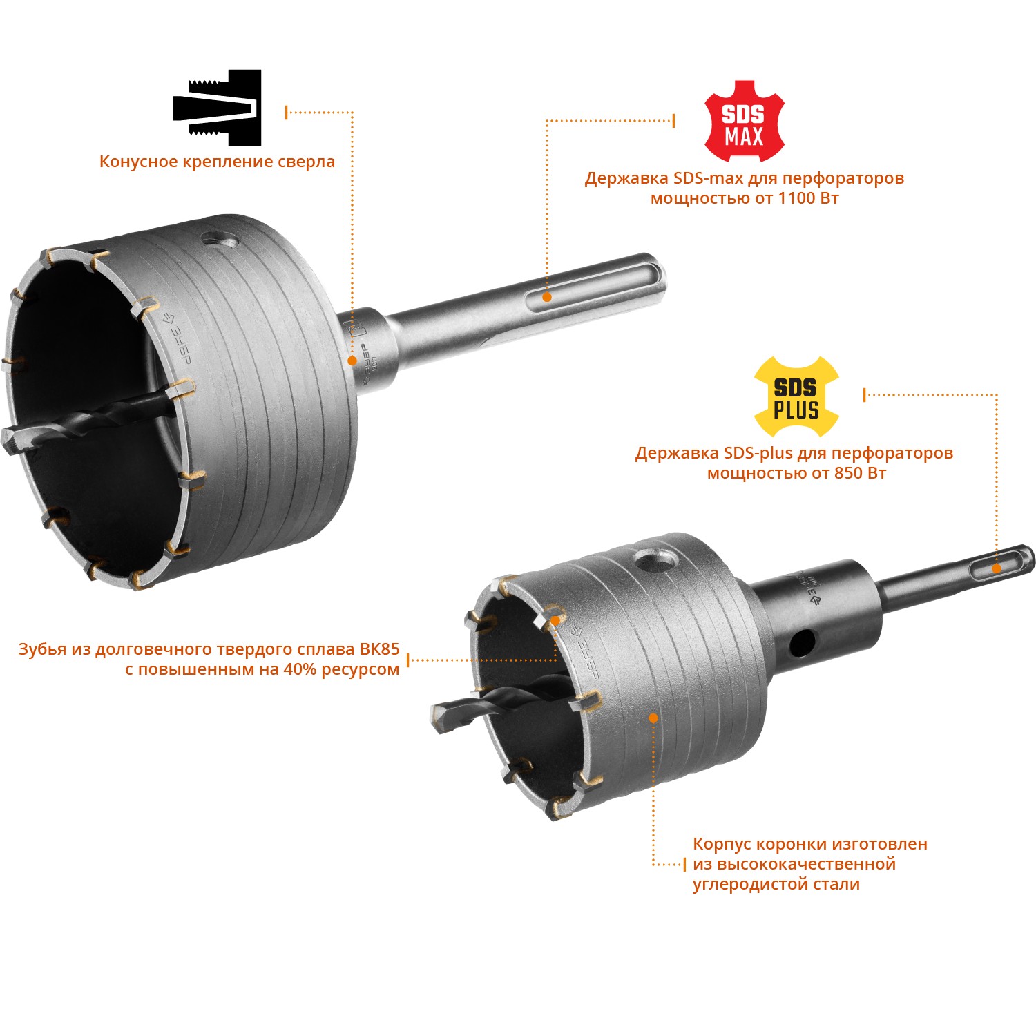- Коронки с твердосплавными зубьями — для бетона и камня.