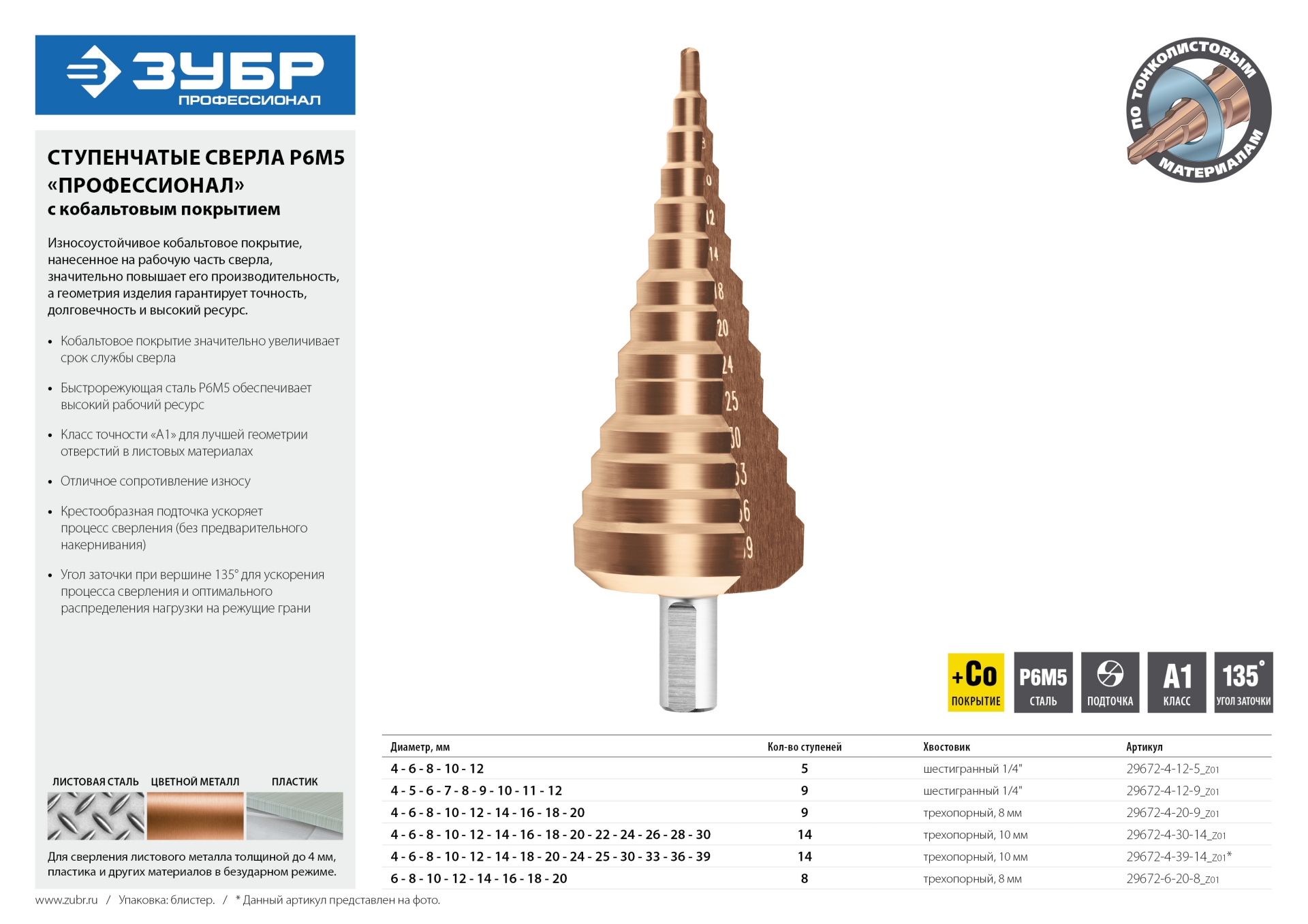 Сверло ступенчатое, 4-12мм, 5 ступеней, кобальтовое покрытие, КОБАЛЬТ, серия Профессионал ЗУБР доступен в интернет‑магазине ВольтМаркет в Орске. Покупая у нас, вы получаете дополнительные преимущества: