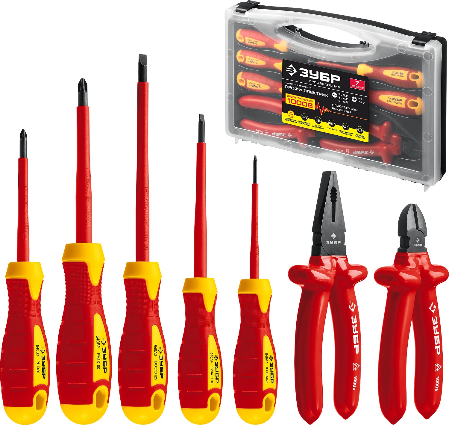 Набор: Губцевый инструмент, диэлектрический, высоковольтный до ~1000В, маслобензостойкая рукоятка, 7предм, Профессионал 2214-H7 ЗУБР в Орске