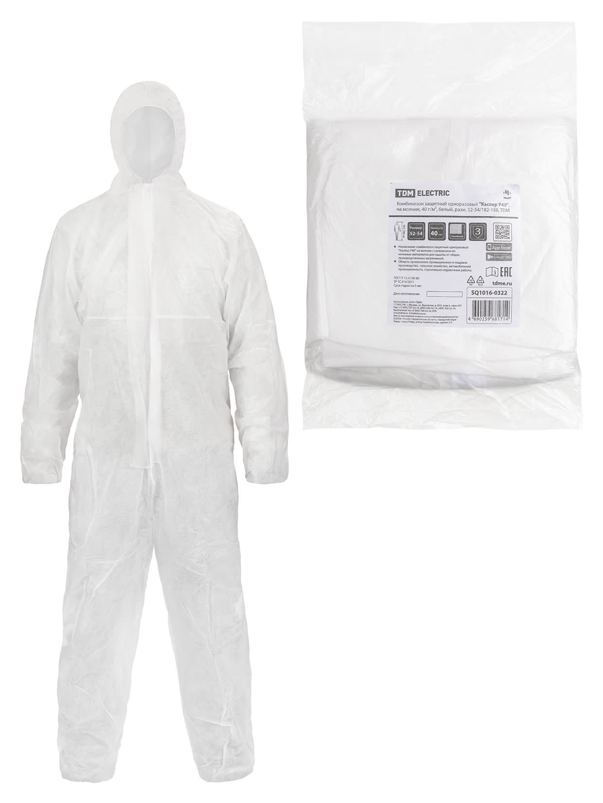 Комбинезон защитный одноразовый "Каспер Р40", на молнии, 40 г/м2, белый, разм. 52-54/182-188, TDM доступен в интернет‑магазине ВольтМаркет в Орске. Покупая у нас, вы получаете дополнительные преимущества: