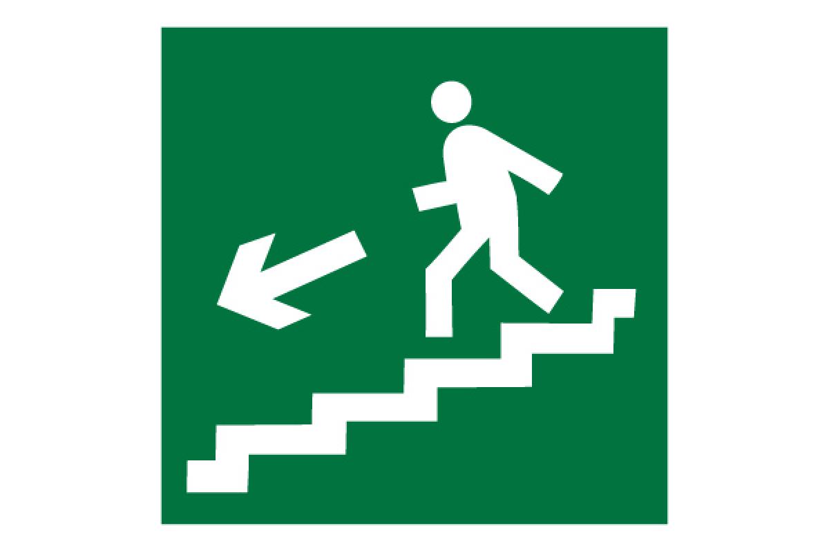 Знак эвакуационный E 14 "Направление к эвакуационному выходу по лестнице вниз налево" 200х200 мм, пластик самоклеящаяся с фотолюминесцентным покрытием в Орске