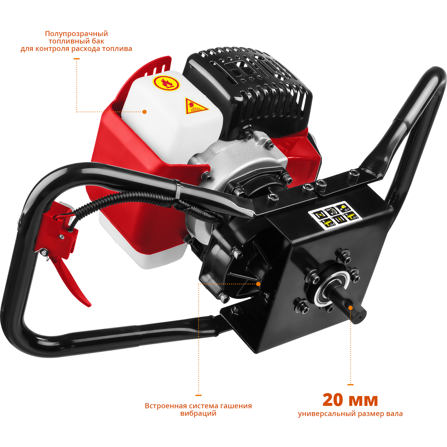 Мотобур — это специализированный инструмент с бензиновым или электрическим двигателем, предназначенный для бурения отверстий в земле, например, для посадки деревьев, установки заборов или столбов.