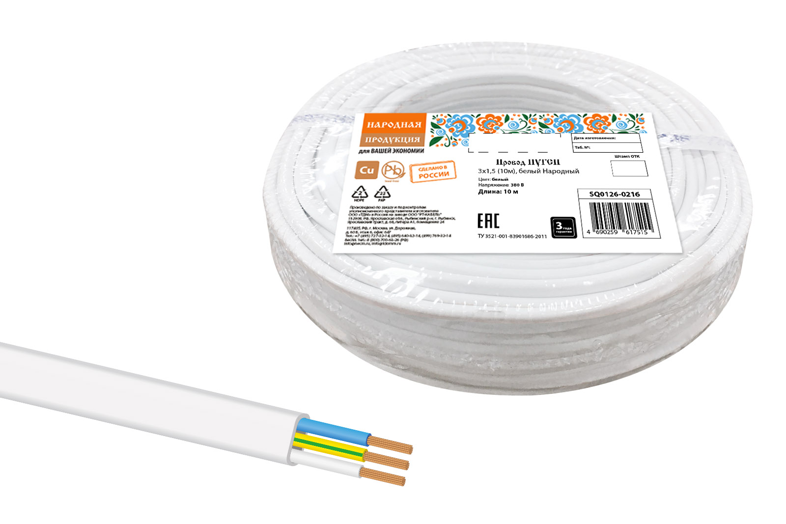 Провод ПУГСП 3х1,5 (10м), белый Народный в Орске