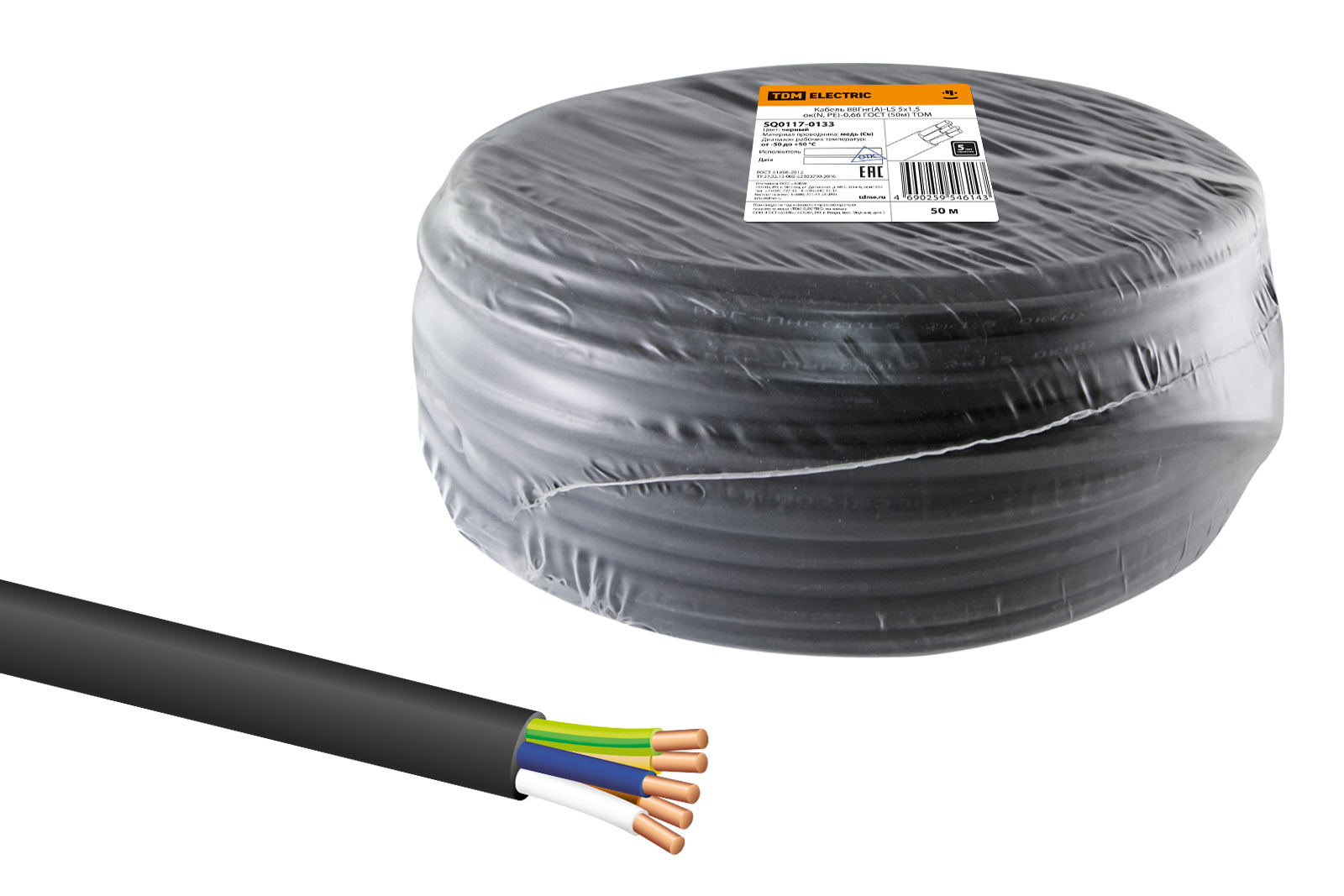 Кабель ВВГнг(А)-LS 5х1,5 ок(N, PE)-0,66 ГОСТ (50м) TDM в Орске