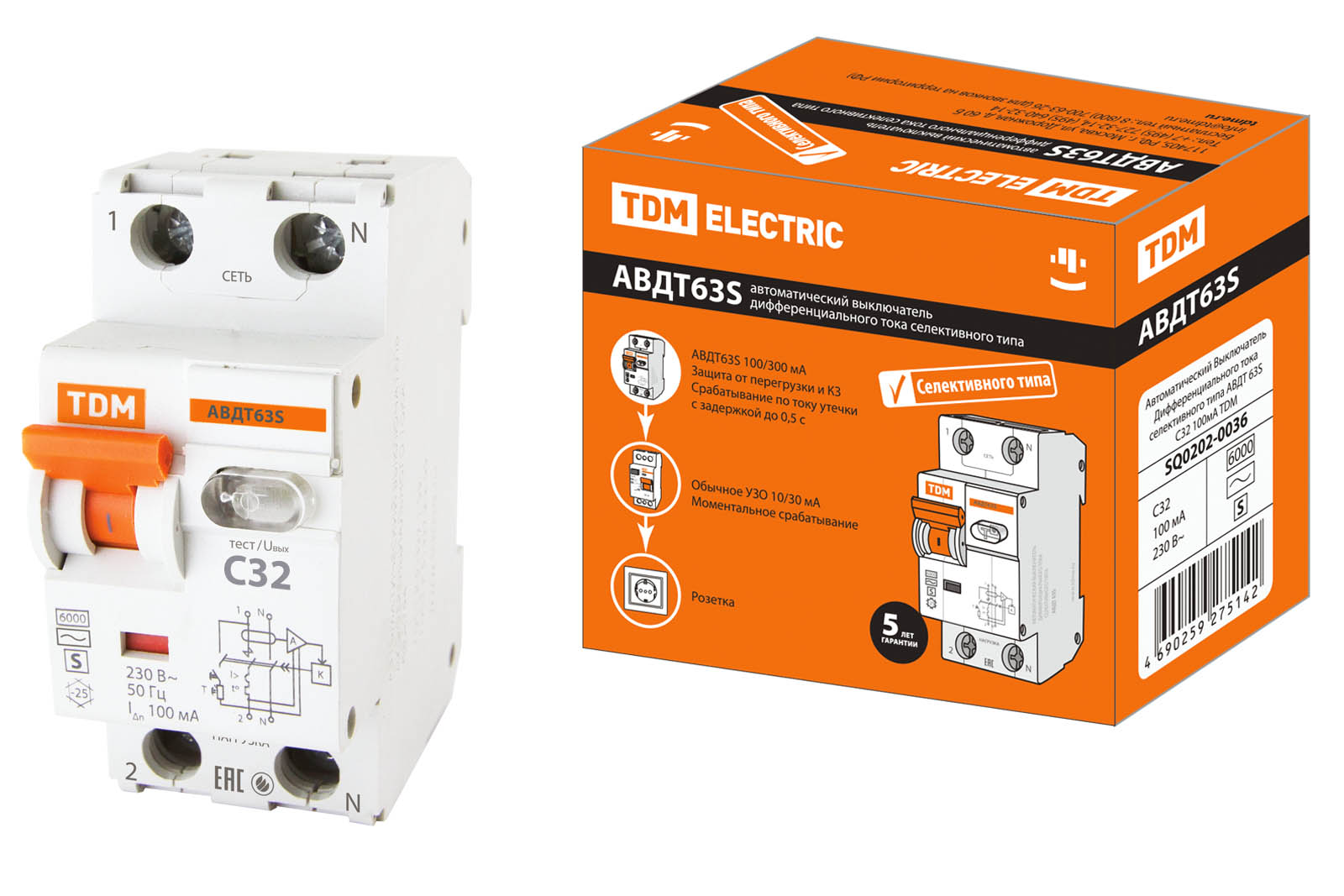 Дифференциальный автоматический выключатель АВДТ 63S 2П (1П+N) 32А С 100мА 6кА тип АС TDM в Орске
