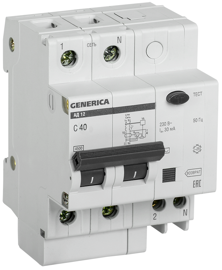 Дифференциальный автоматический выключатель АВДТ АД12 2П 40А 30мА GENERICA в Орске