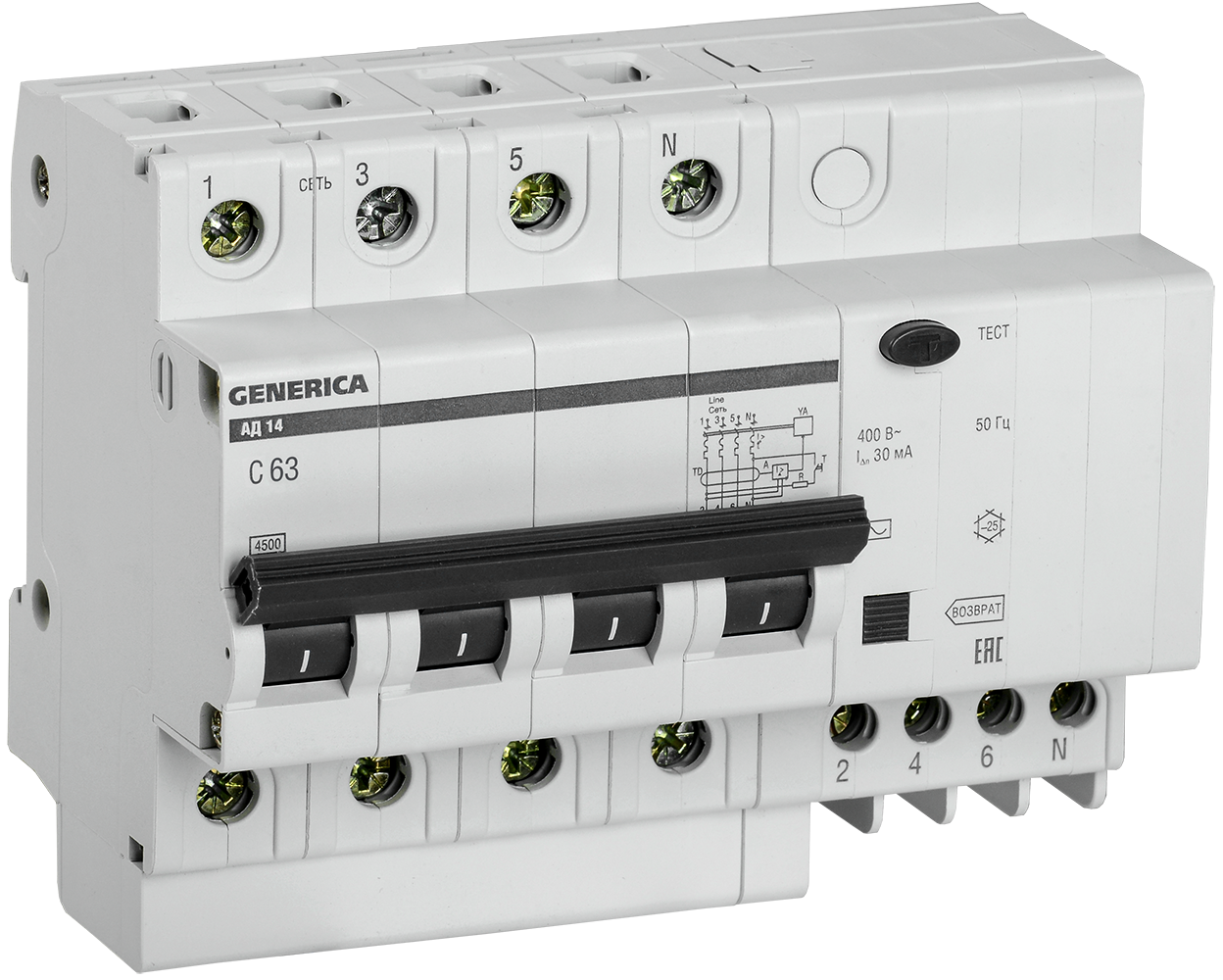 Дифференциальный автоматический выключатель АВДТ АД14 4П 63А 30мА GENERICA в Орске