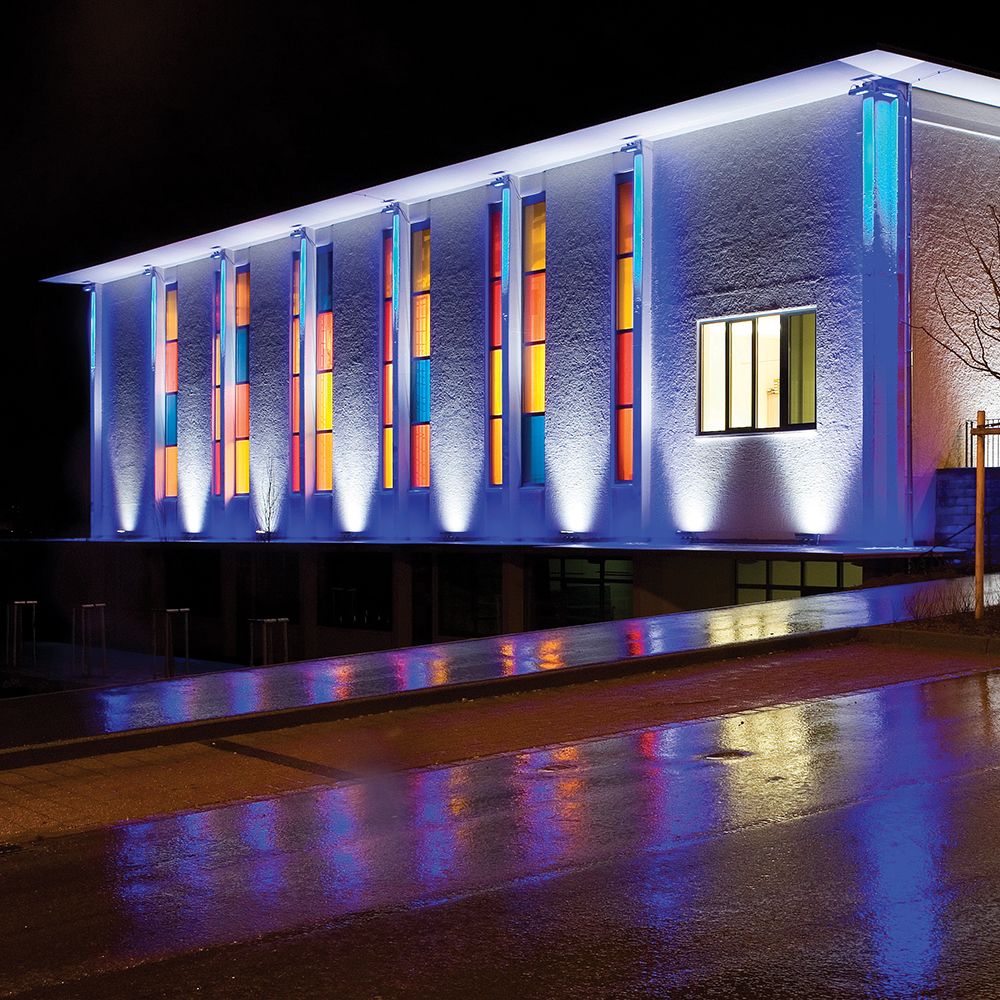 Прожектор — это мощный источник света, который используется для освещения больших открытых пространств, фасадов зданий, дворов, спортивных площадок и других территорий на улице.