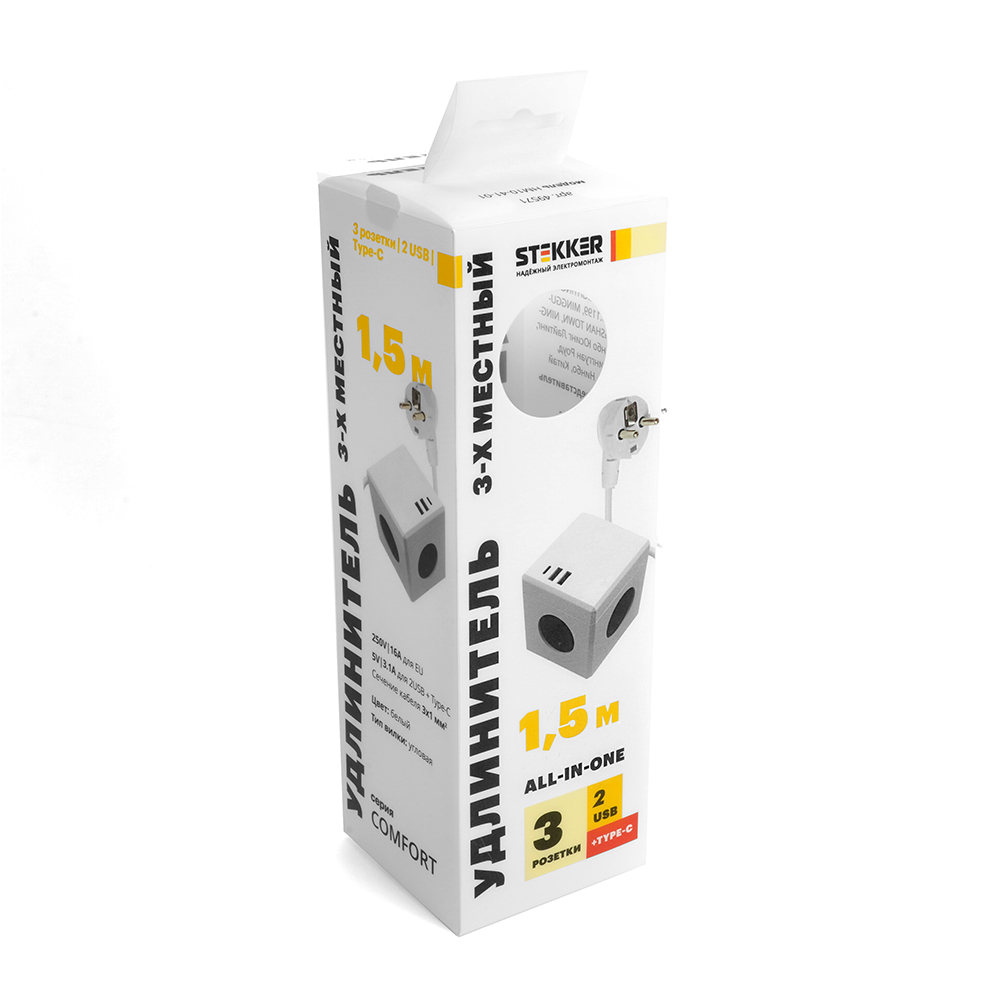 HM10-41-01 Удлинитель 3-местный с/з, 3x1мм², 1.5м, 250В, 16А, 2USB+1С, 5V 3,1А, серия Comfort, белый STEKKER доступен в интернет‑магазине ВольтМаркет в Орске. Покупая у нас, вы получаете дополнительные преимущества:
