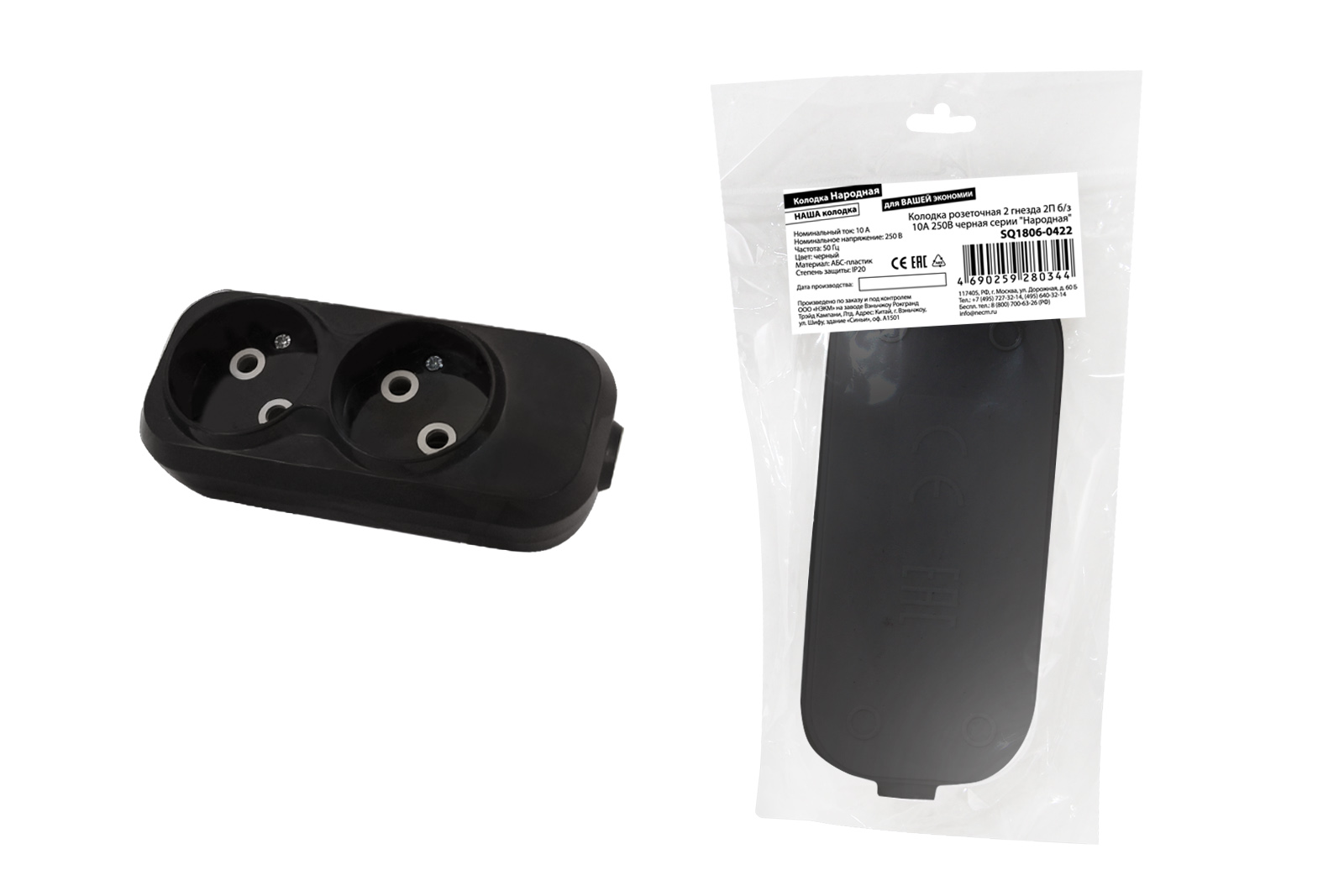 Колодка розеточная 2 гнезда 2П б/з 10А 250В черная серии "Народная" в Орске
