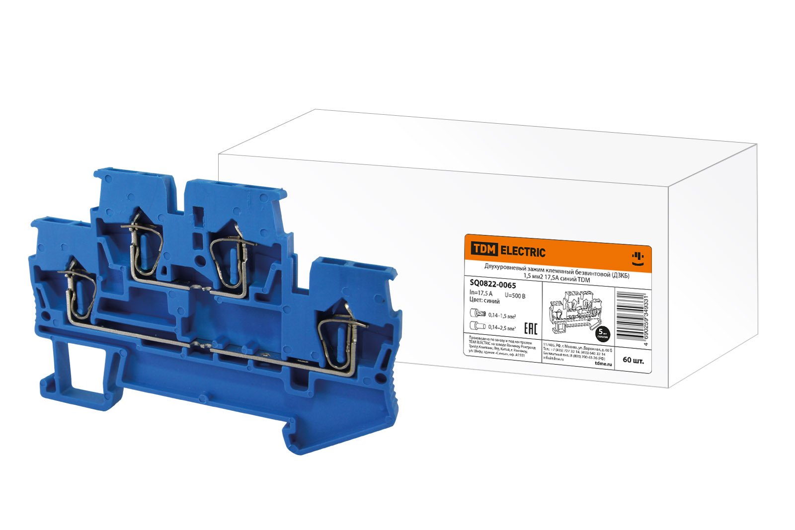 Двухуровневый зажим клеммный безвинтовой (ДЗКБ) 1,5 мм2 17,5А синий TDM в Орске